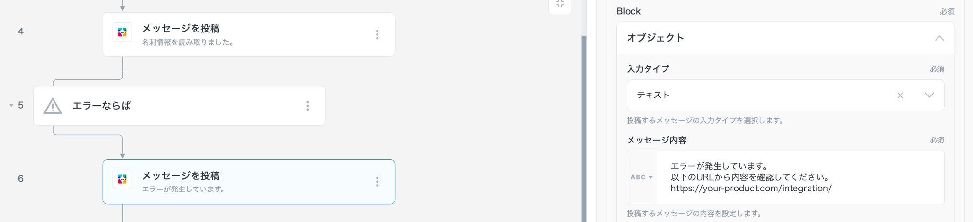 「エラーならば」の内側に、新たにSlackコネクタを配置し、エラー時のメッセージを設定します。