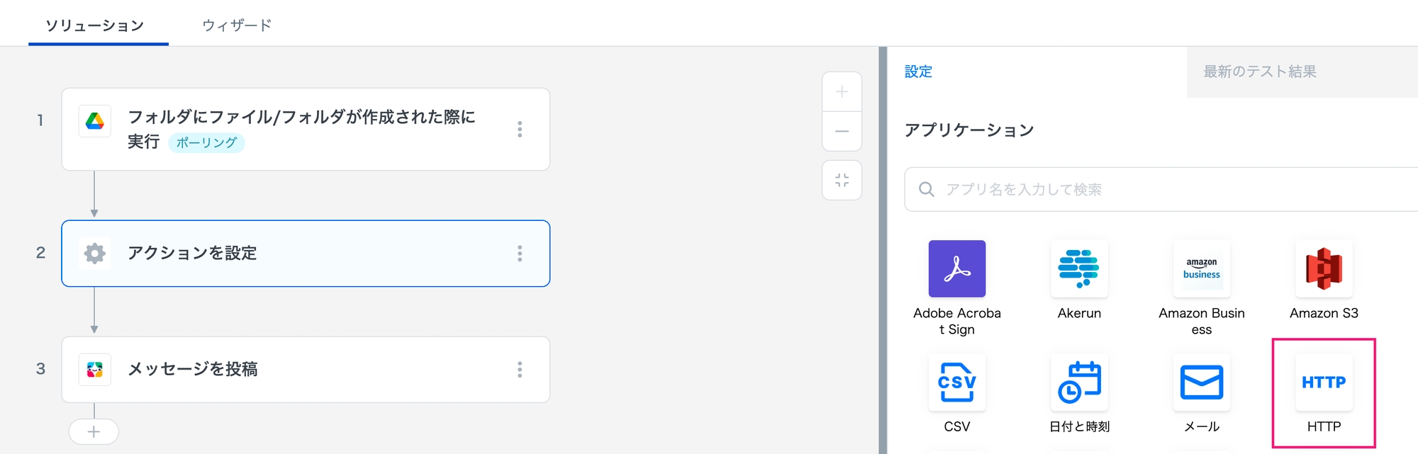 1ステップ目と2ステップ目の間で「ステップを追加」し、アクションとして「HTTP」を追加します。