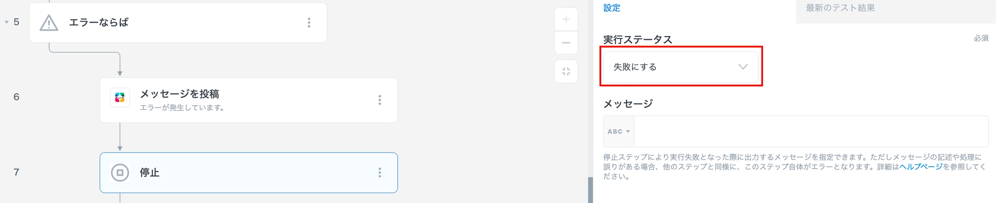 これを「失敗」のステータスにするために、停止ステップを追加します。