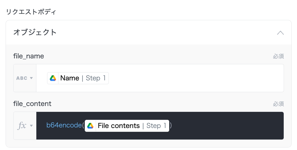 リクエストボディには、Google Driveトリガーで取得した値を設定します。