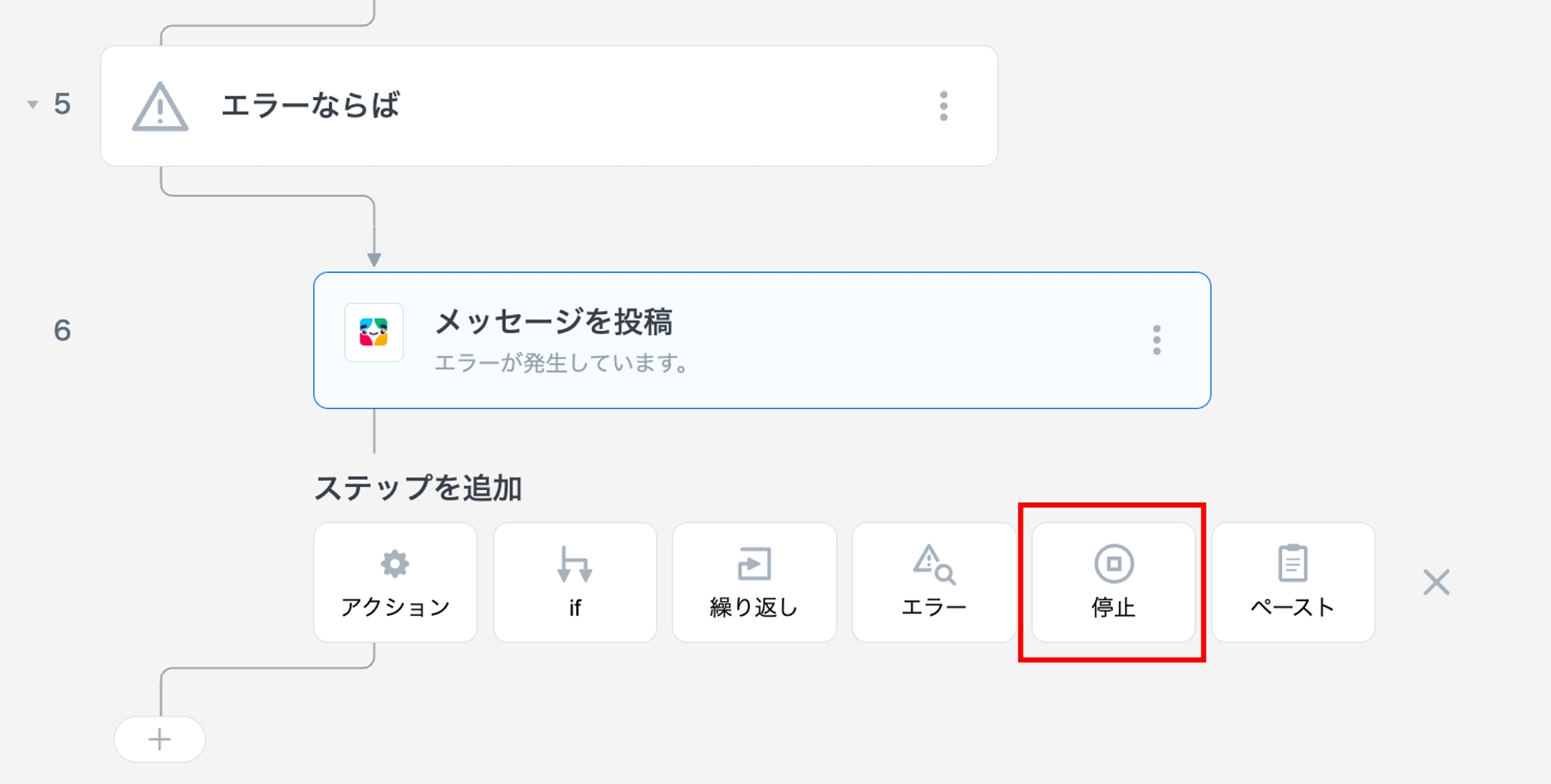 「エラーならば」の内側で停止ステップを追加します。