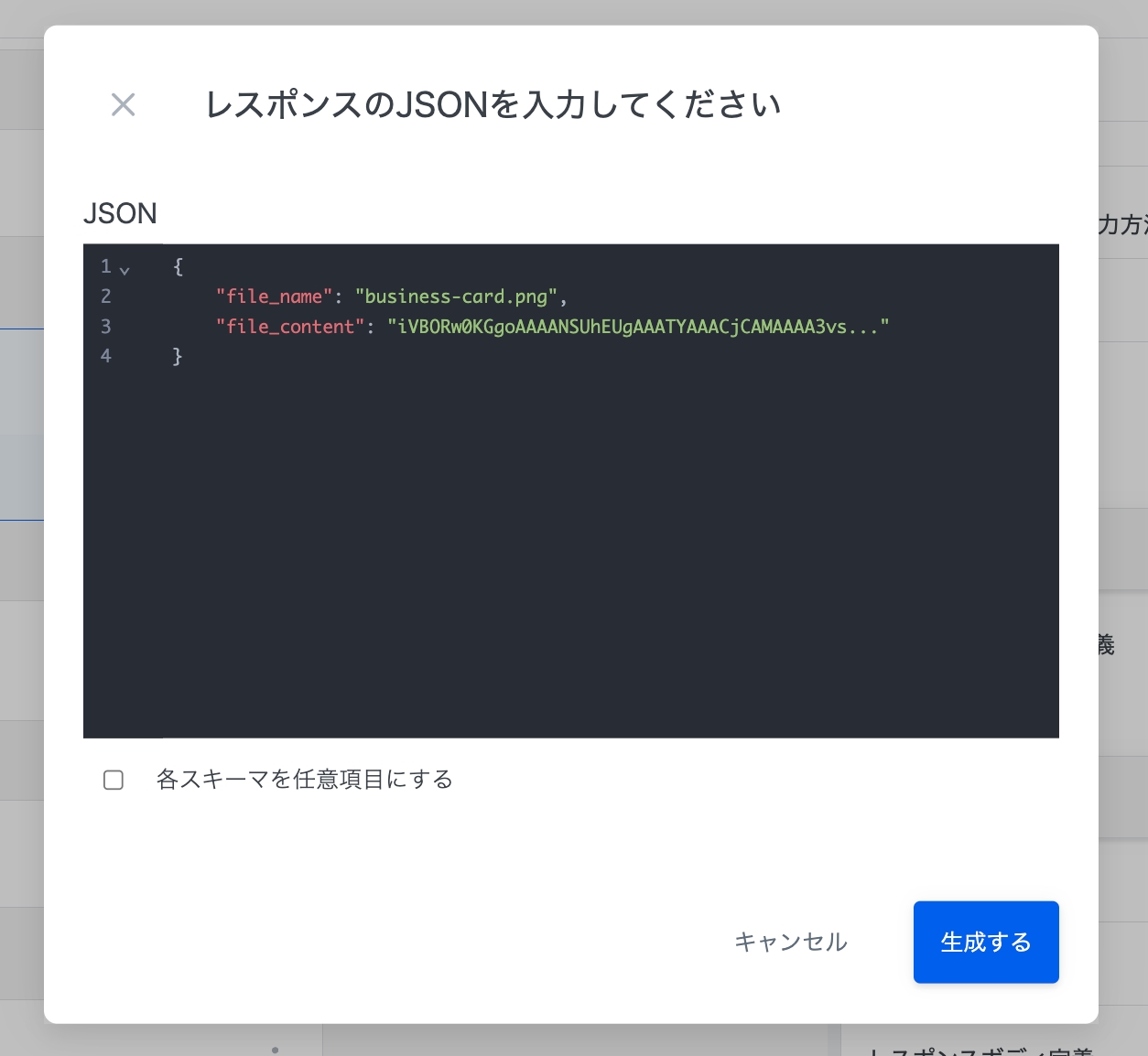 「生成する」を押すとリクエストボディの定義が自動で生成されます。