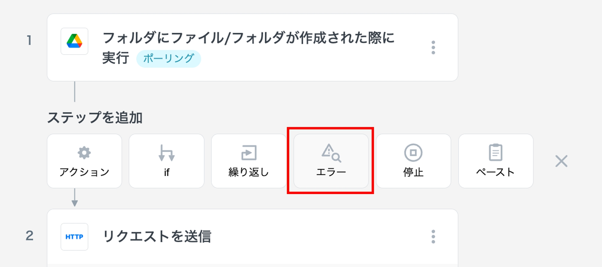 ステップ1と2の間に「エラー」ステップを追加します。
