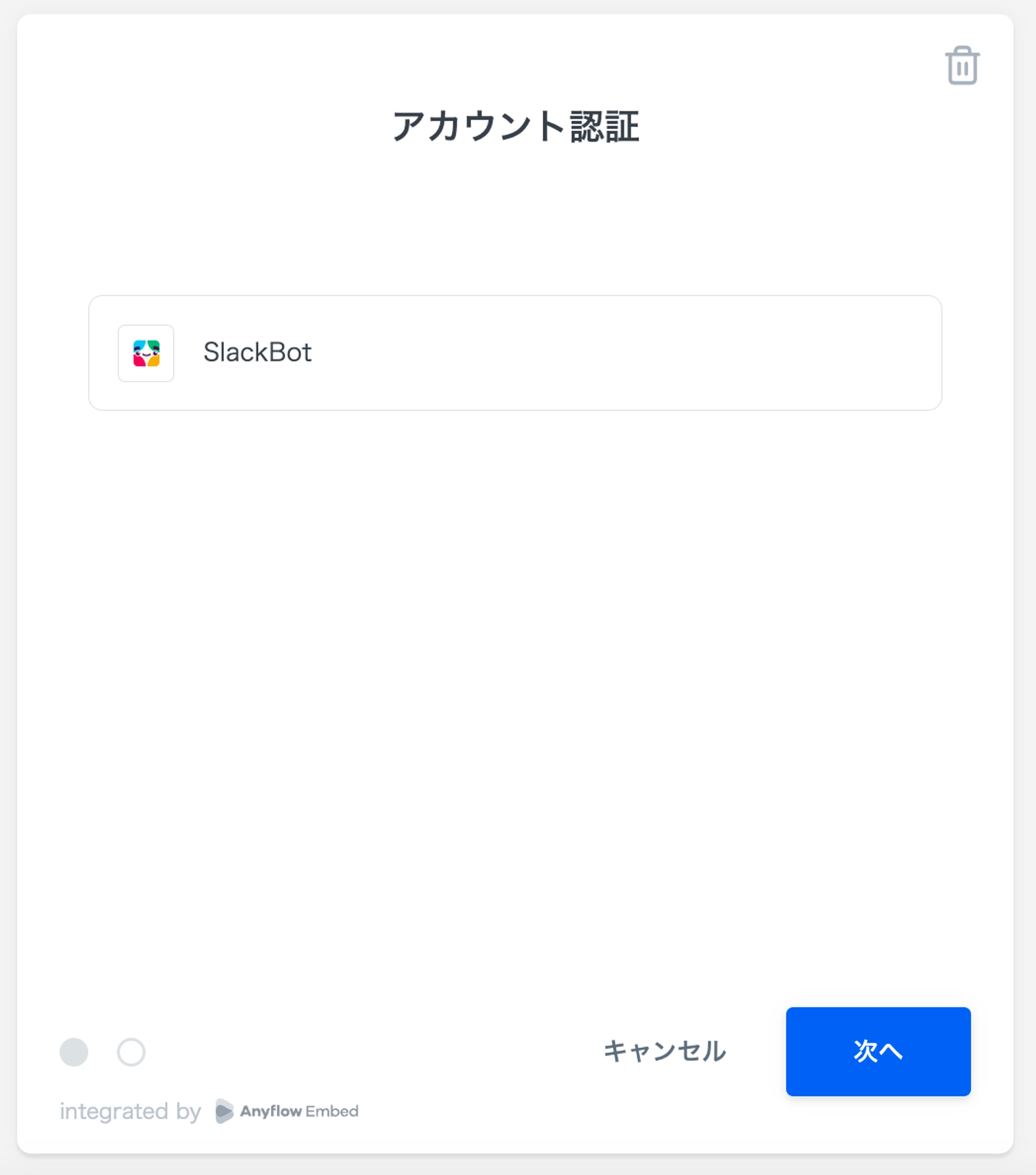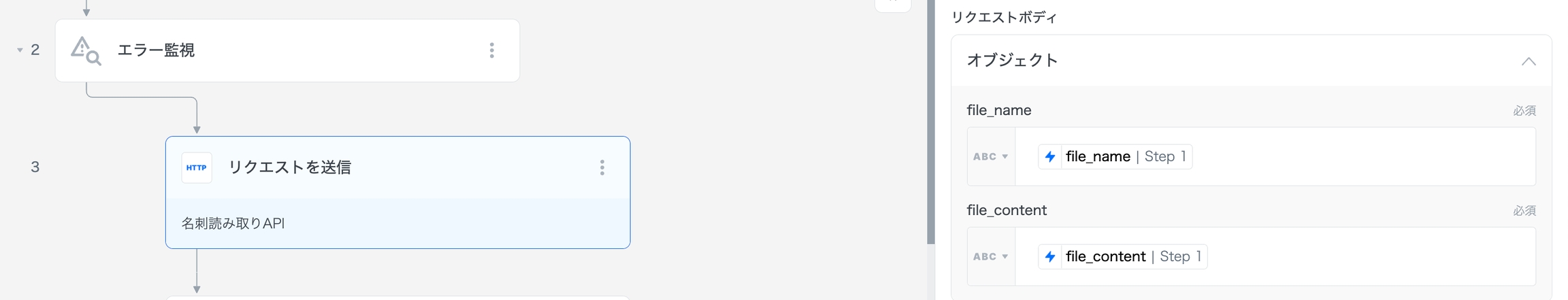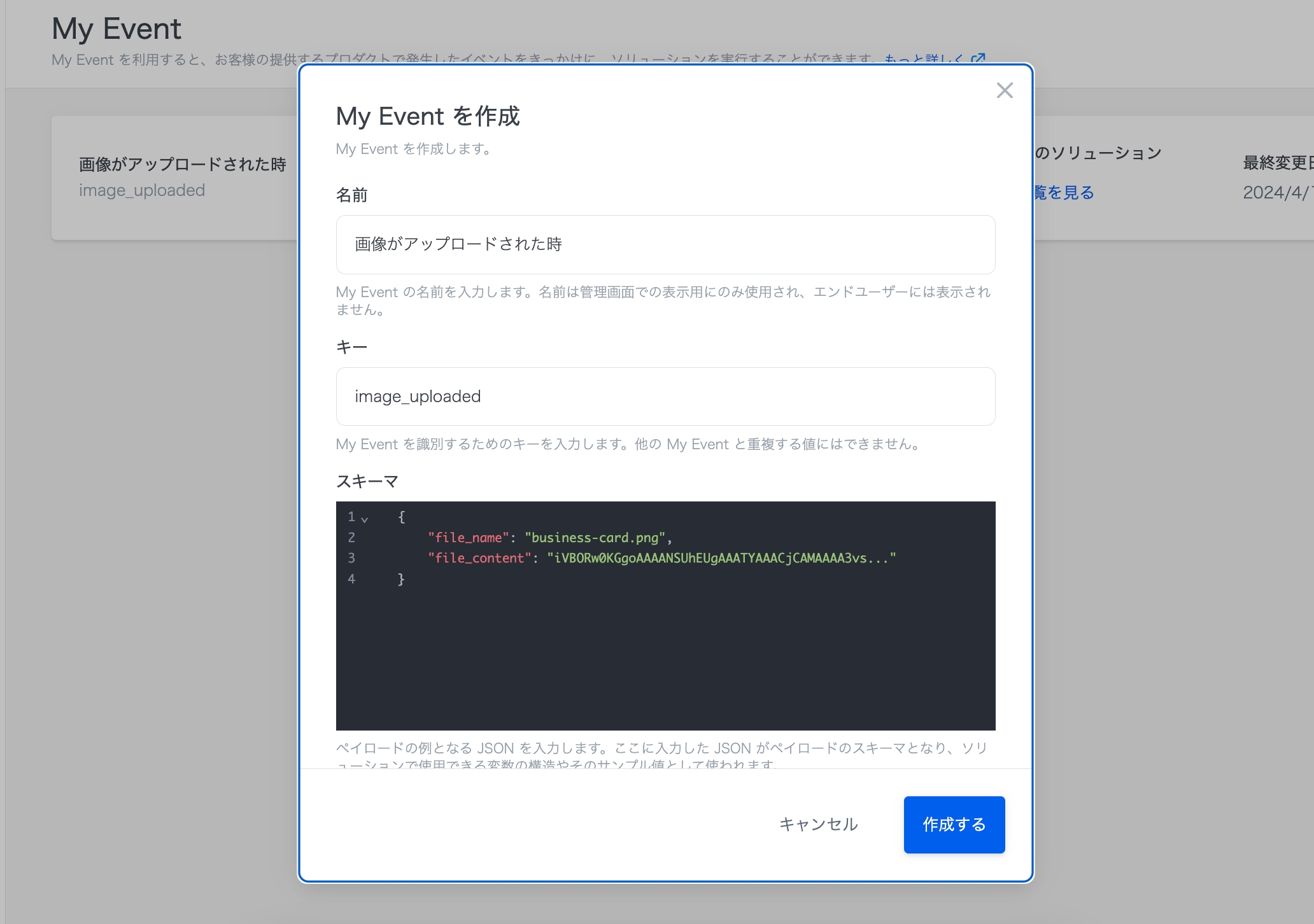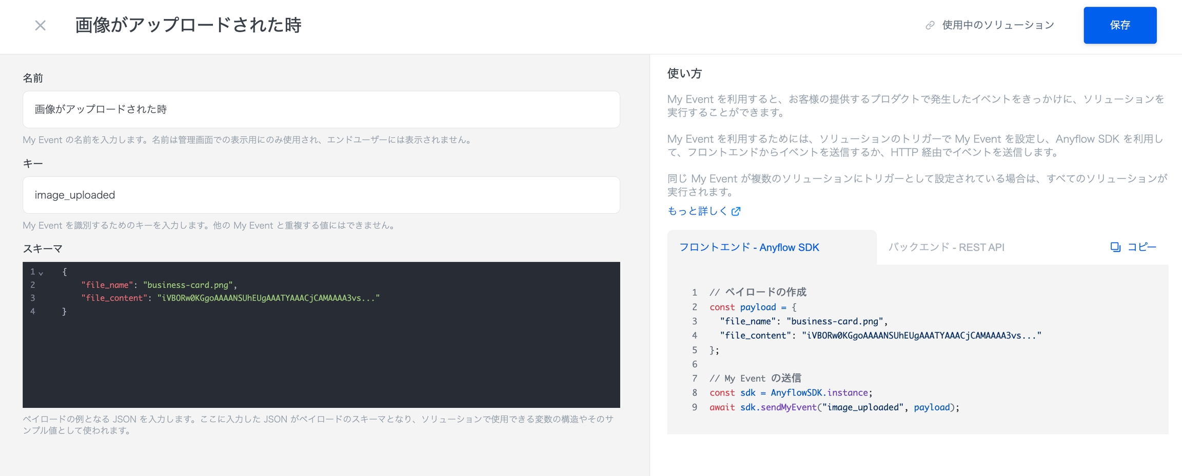 curl https://for-product-api.anyflow.jp/sdk/send_my_event \ --request POST \ --header "Authorization: Bearer <アクセストークン>" \ --header "Content-Type: application/json" \ --data '{ "key": "image_uploaded", "payload": { "file_name": "business-card.png", "file_content": "iVBORw0KGgoAAAANSUhEUgAAATYAAACjCAMAAAA3vs..." } }'