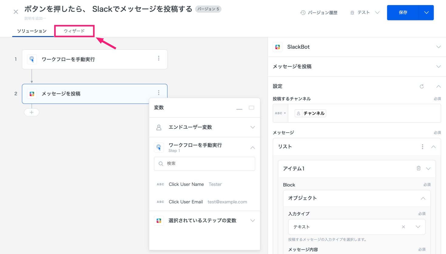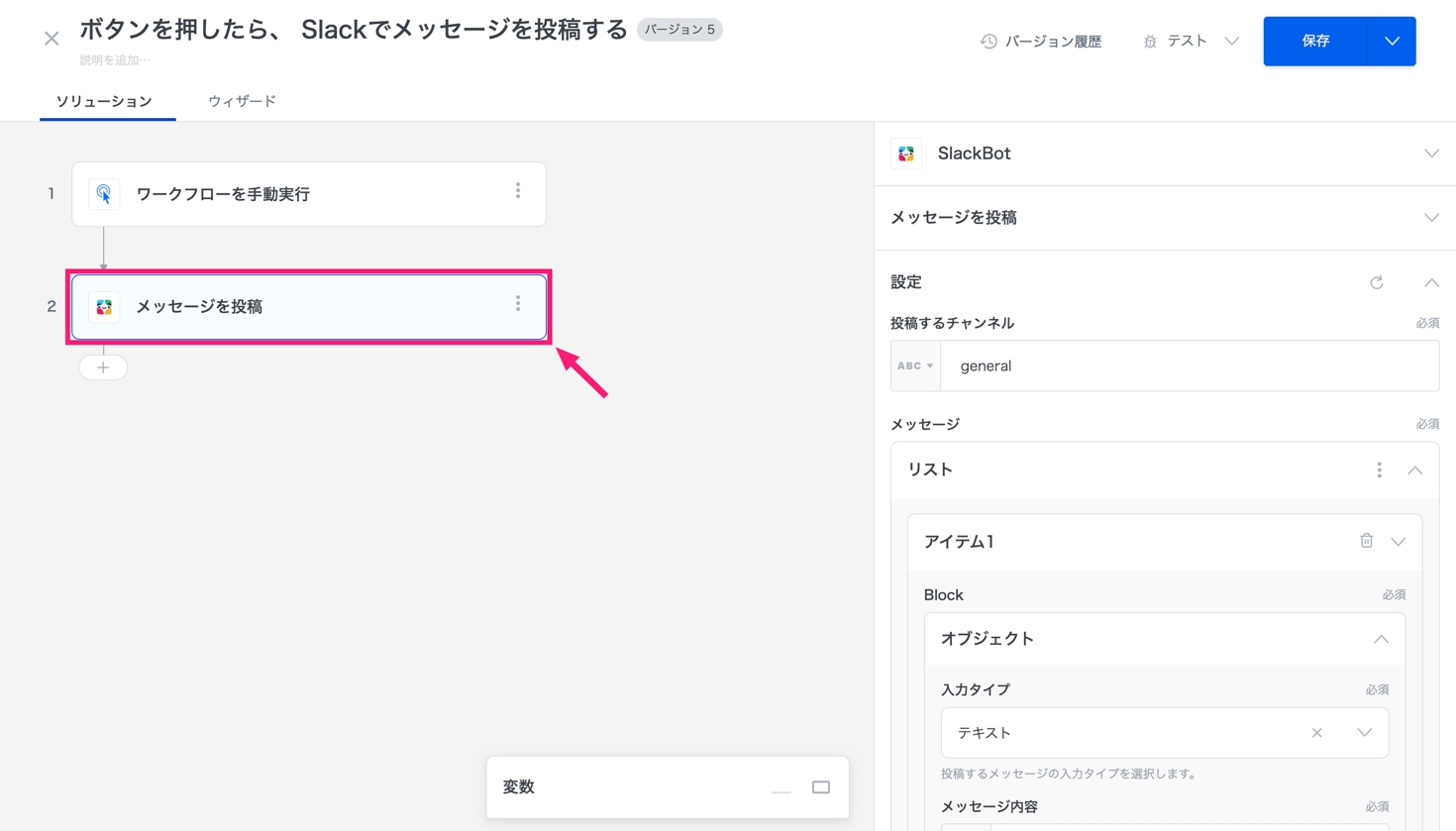 作成したエンドユーザー変数を、[投稿するチャンネル] に配置します。
