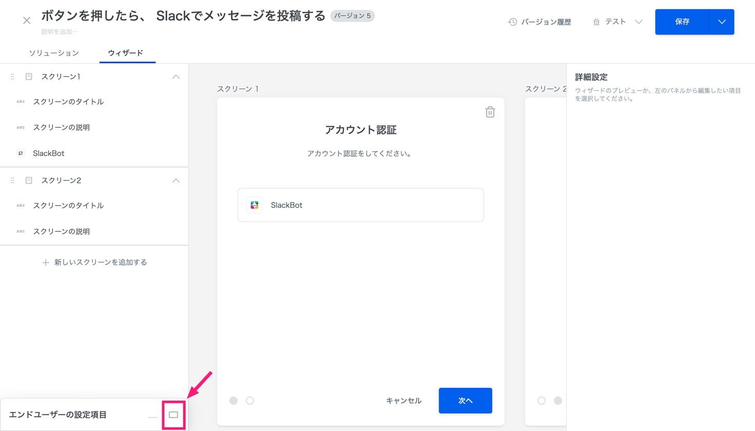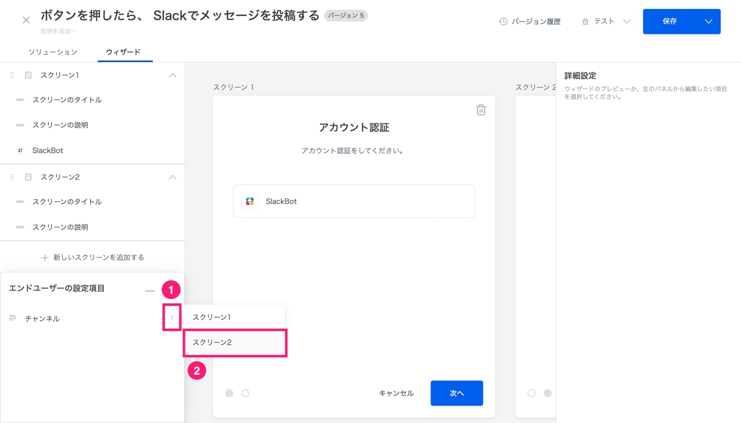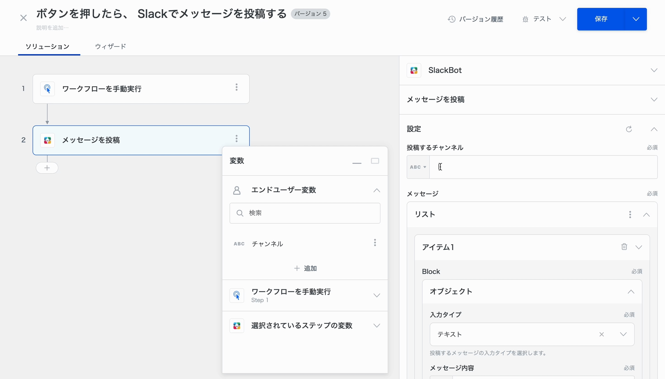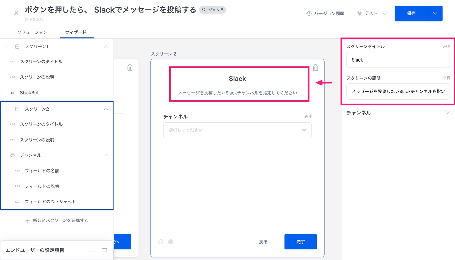 エンドユーザー変数を配置したスクリーン2では、認証したSlackアカウントに紐付く [チャンネル] が選択可能になりました。