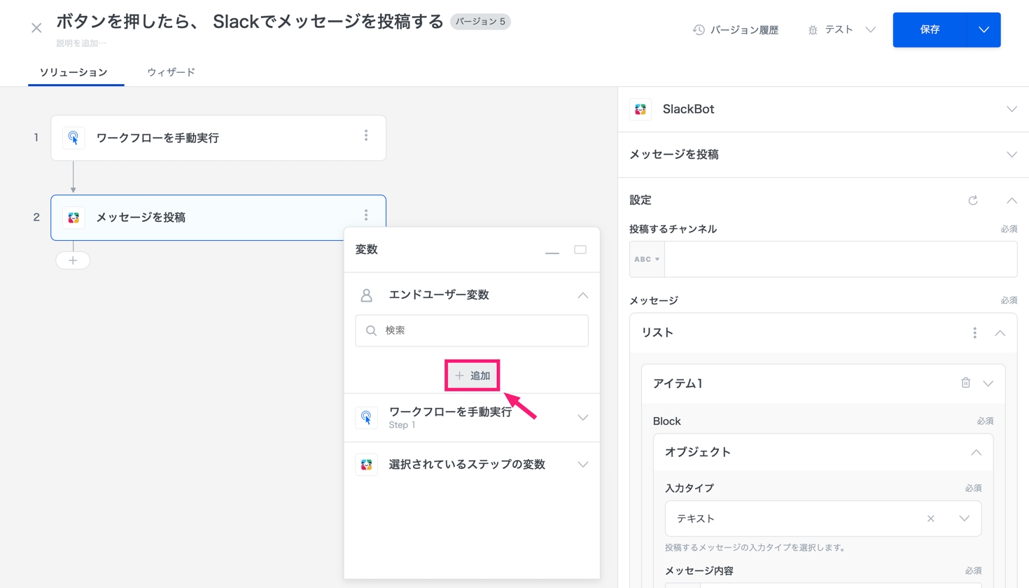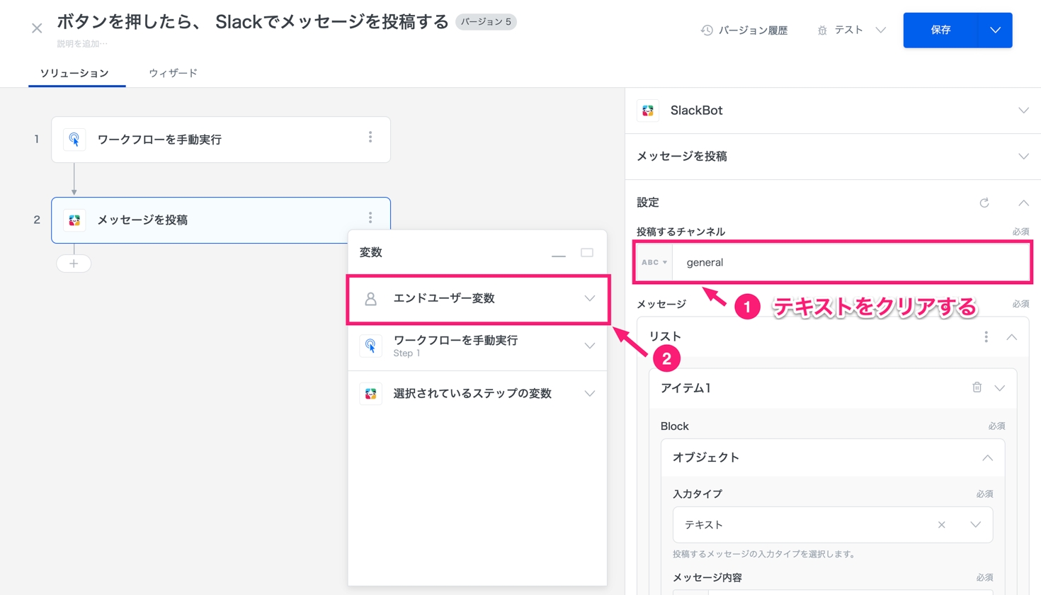 一度、[投稿するチャンネル] の入力フィールドの枠内をクリックし、エンドユーザー変数を選択することで配置可能です。