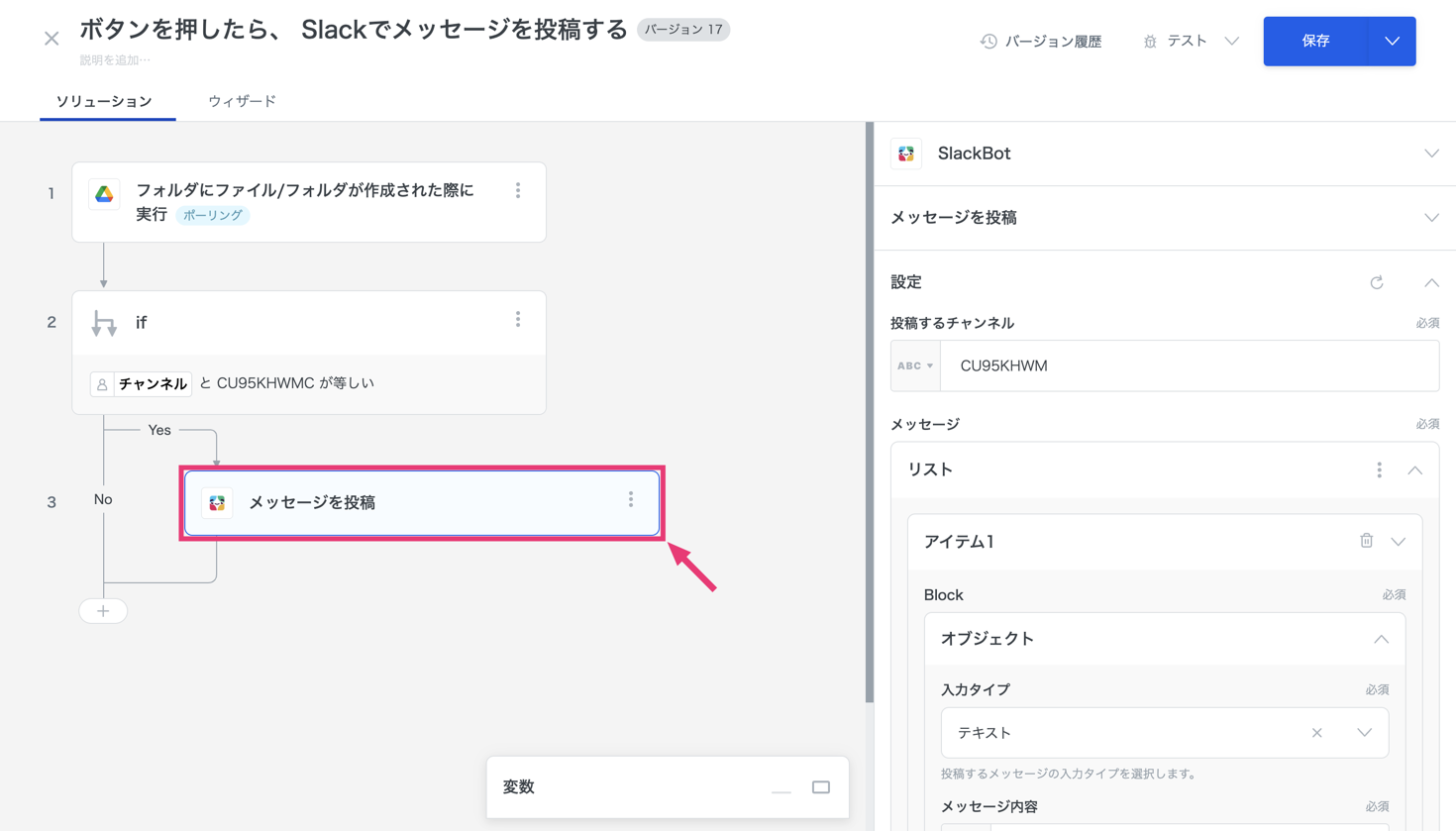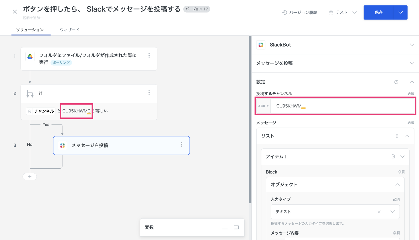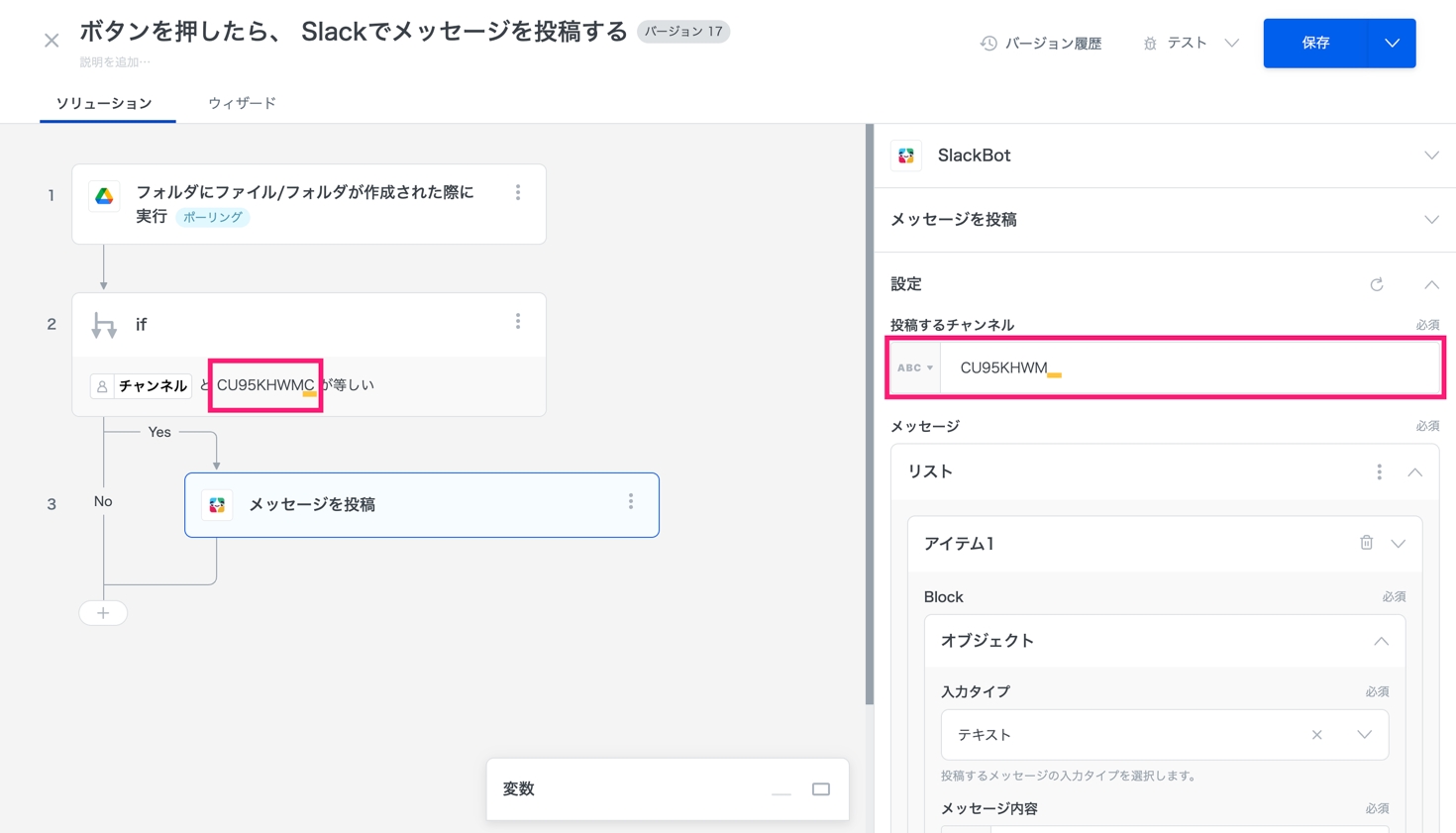 設定で指定した変数が正しくメッセージ内容に反映されているか確認します。
