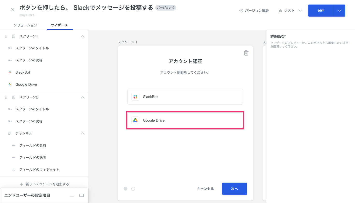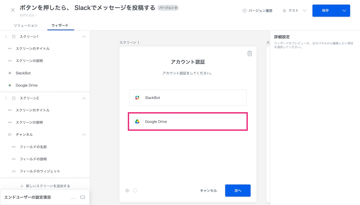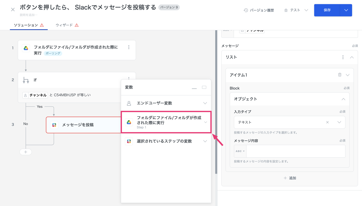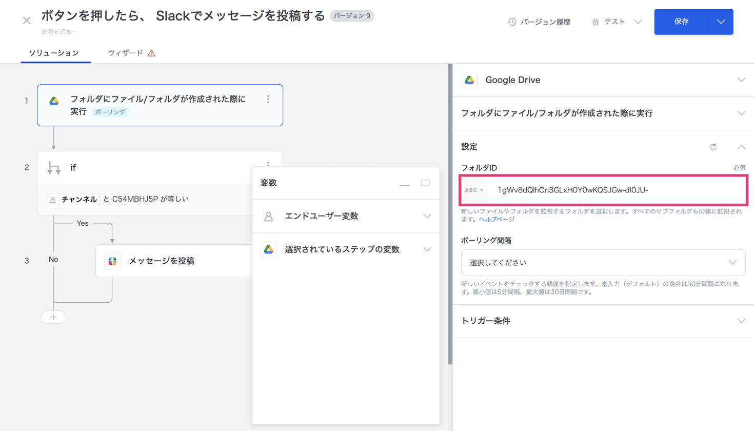 Lv3のソリューションのトリガーを、Google Driveトリガーに変更し、 Google Driveのフォルダにファイル/フォルダが作成された際に、トリガーで取得した情報をSlackのメッセージで投稿するソリューションを設定します。