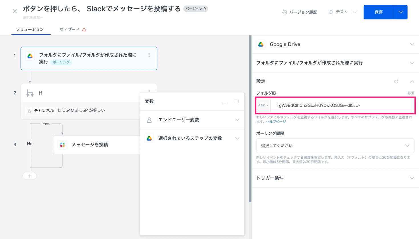 上記のように、フォルダIDでフォルダを直接指定することも可能ですが、エンドユーザーにフォルダを選択してもらうことも可能です。 詳細の設定方法については、Google Driveトリガー をご確認ください。