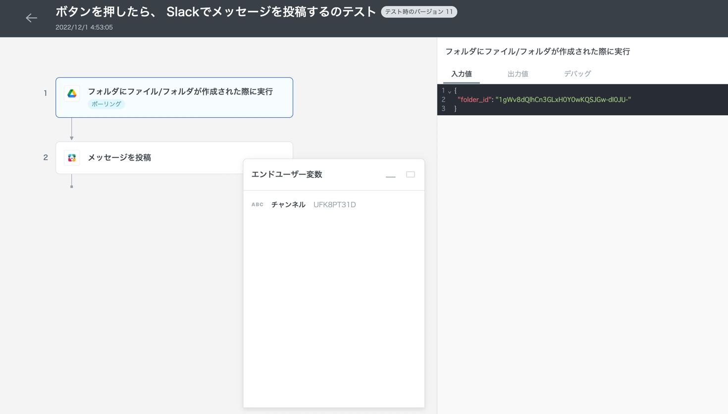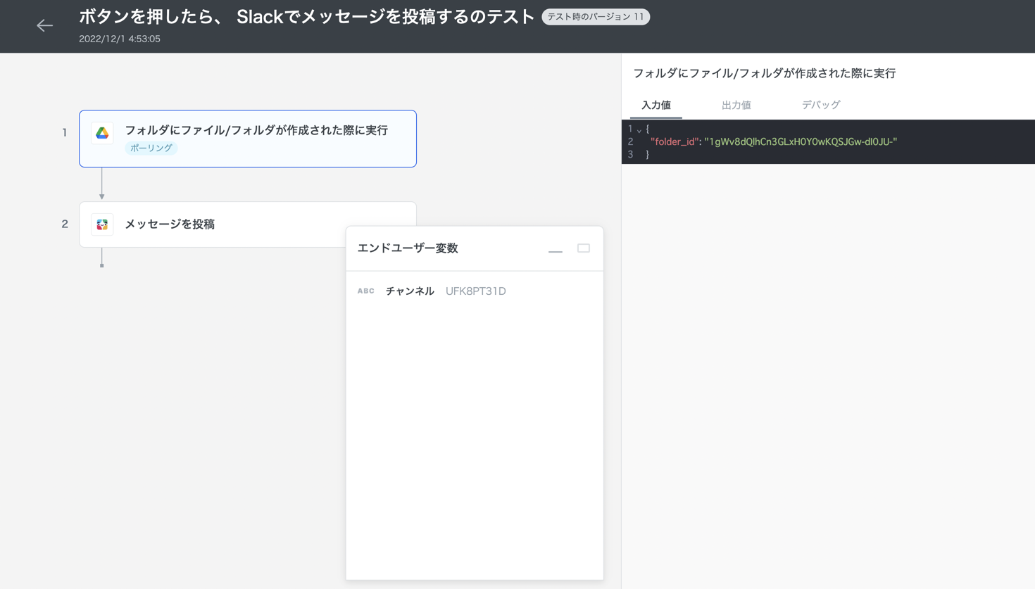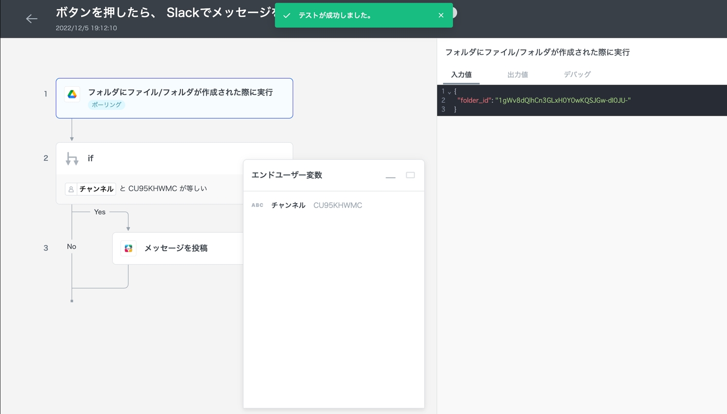 上記にて原因が判明したため、SlackのチャンネルIDを正しい形で入力し、もう一度テスト実行をしてみましょう。