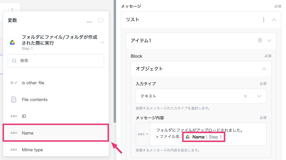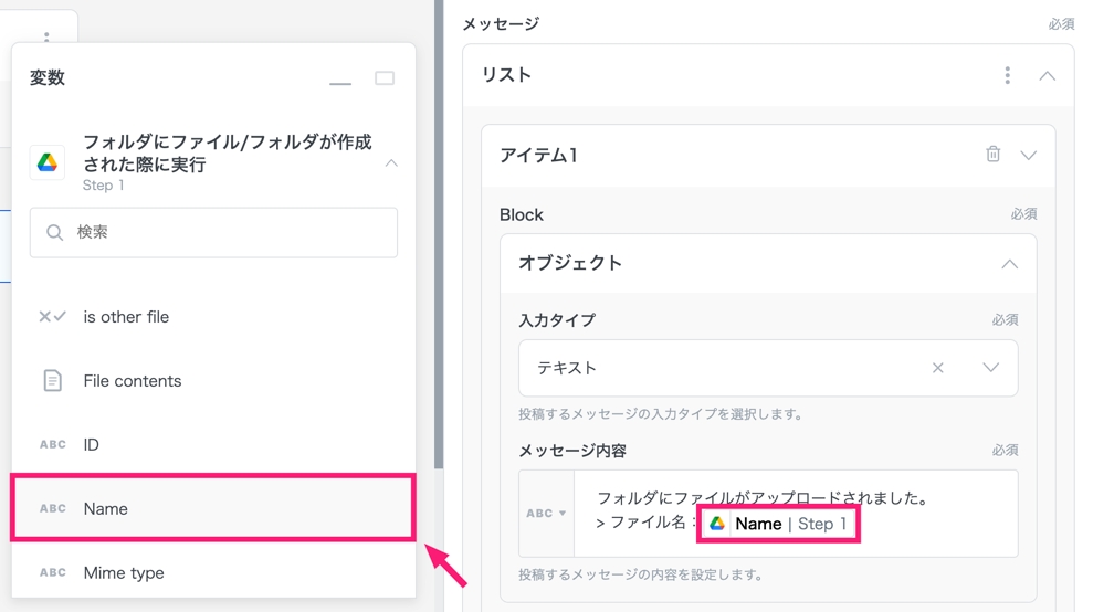 メッセージ内容をテキストで入力し、変数ウィンドウから使用したい変数を選択します。