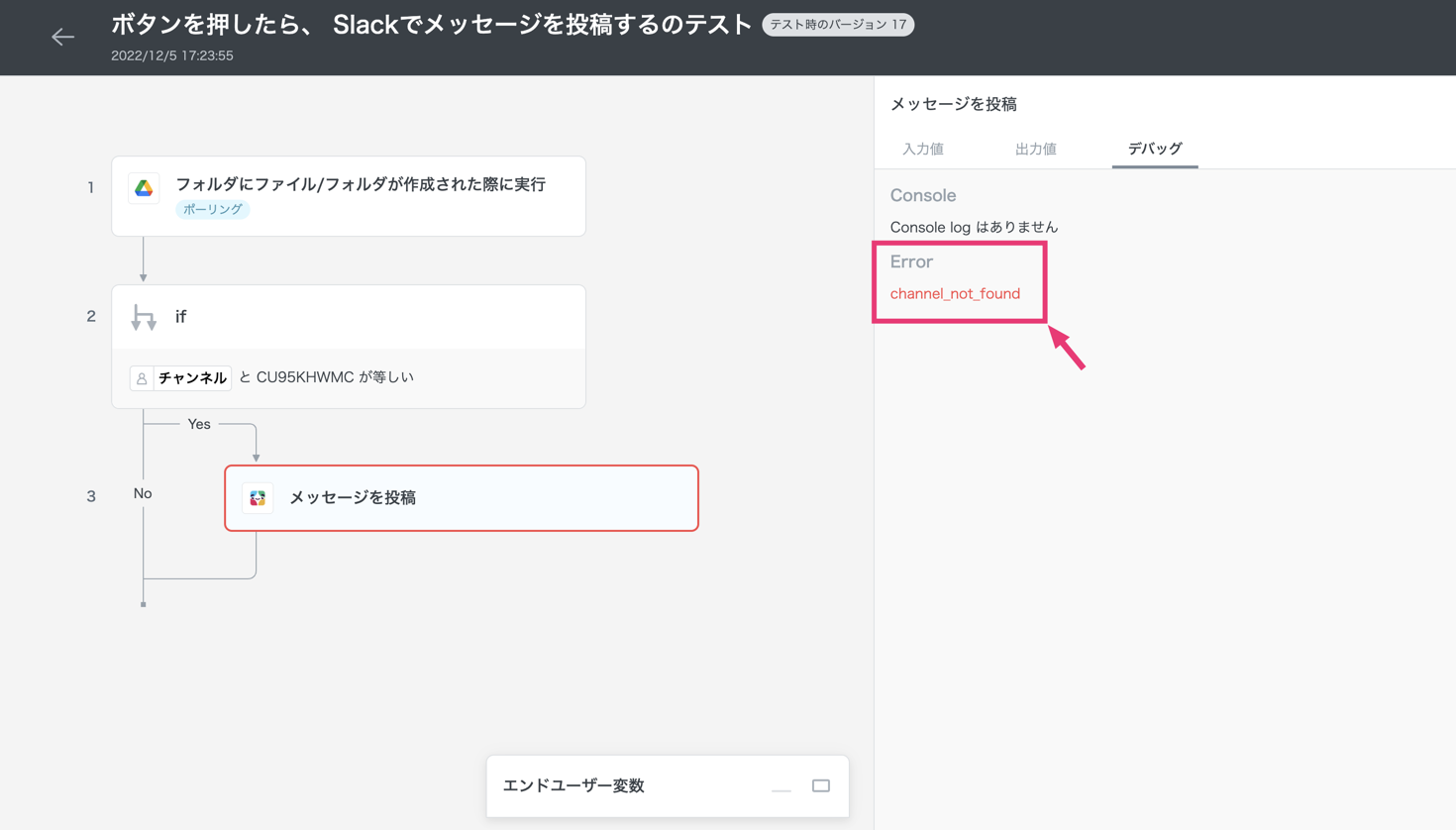 上記を踏まえて、"Slackでメッセージを投稿する際に指定しているチャンネルが見つからない可能性がある" という仮説を立てます。