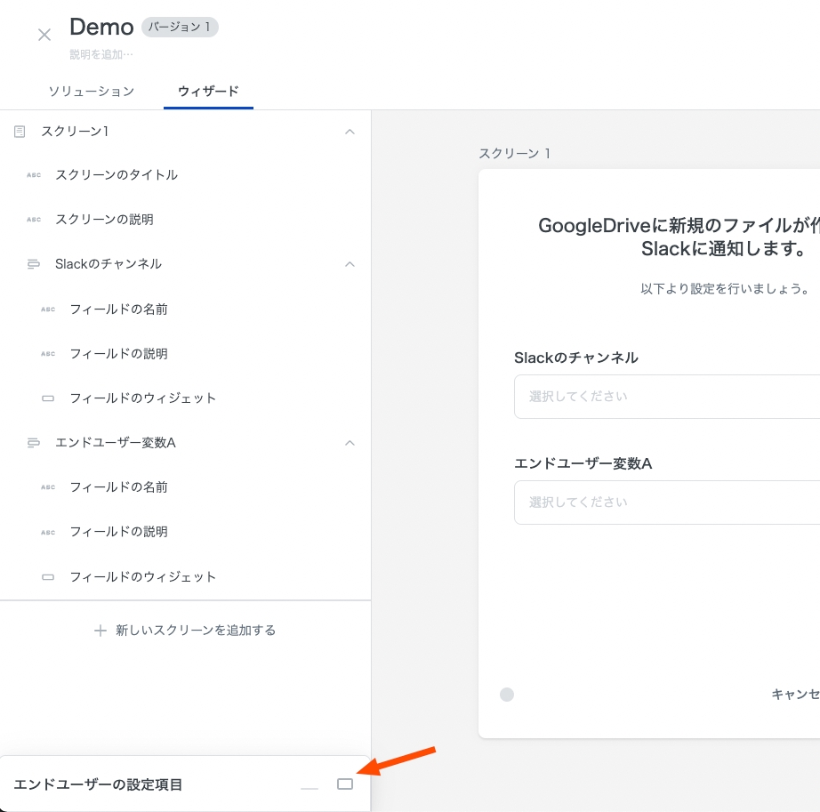 ソリューションエディターで作成したエンドユーザー変数をウィザードに表示し、エンドユーザーに入力を促すためには、ウィザードエディターの左ペインの下部にあるエンドユーザーの設定項目ウィンドウを表示します。