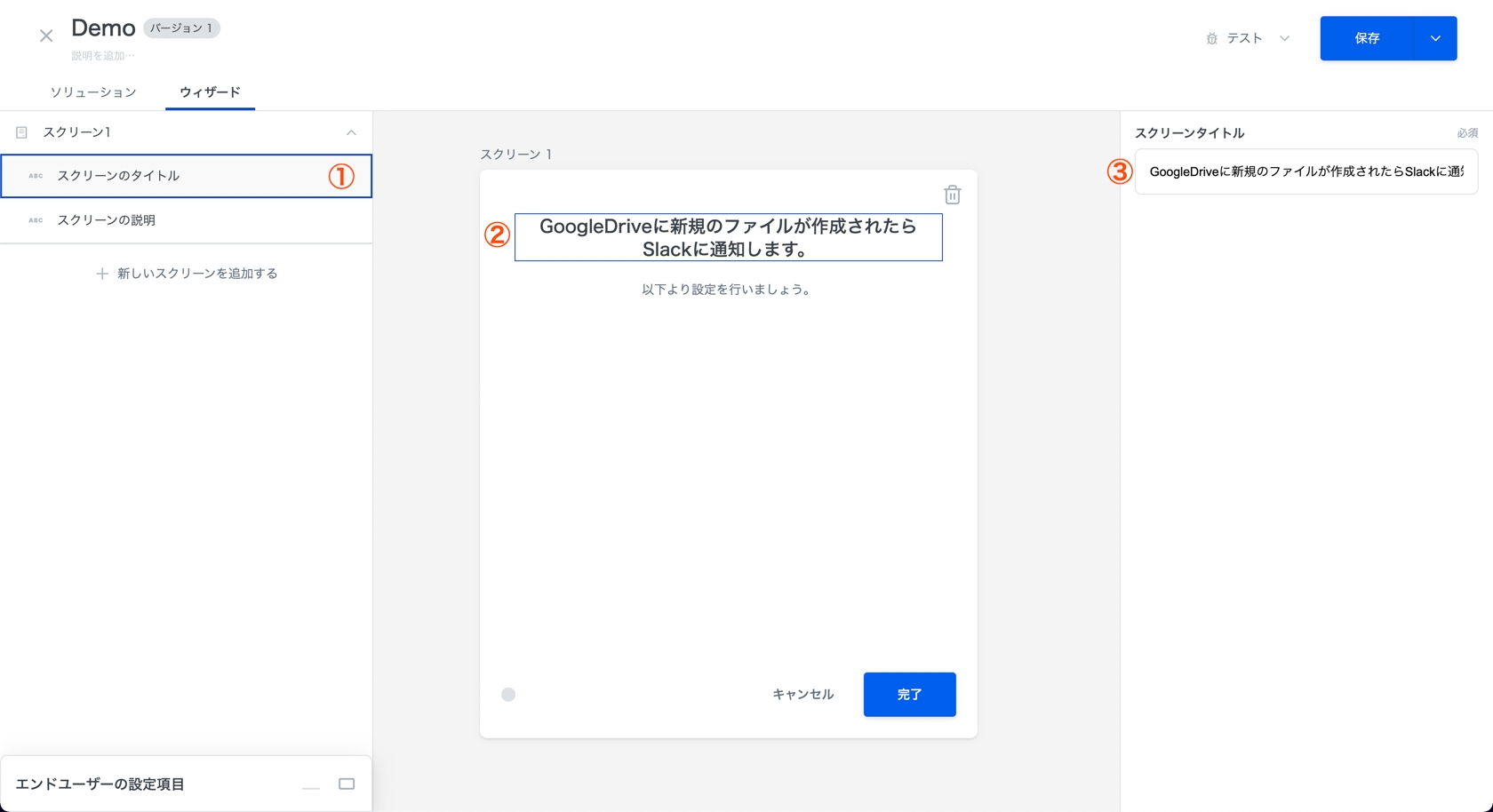 ウィザードエディターは、ウィザードに表示するテキストや、エンドユーザーの設定項目を制御するためのものです。