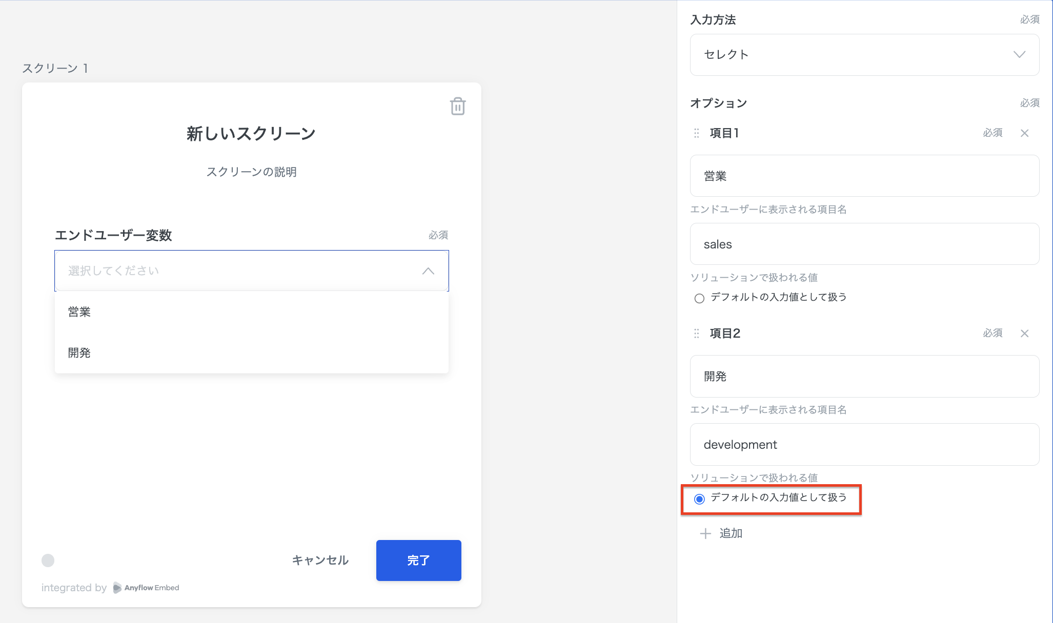 「デフォルトの入力値として扱う」のラジオボタンにより、1つの項目をデフォルトで選択状態にできます。