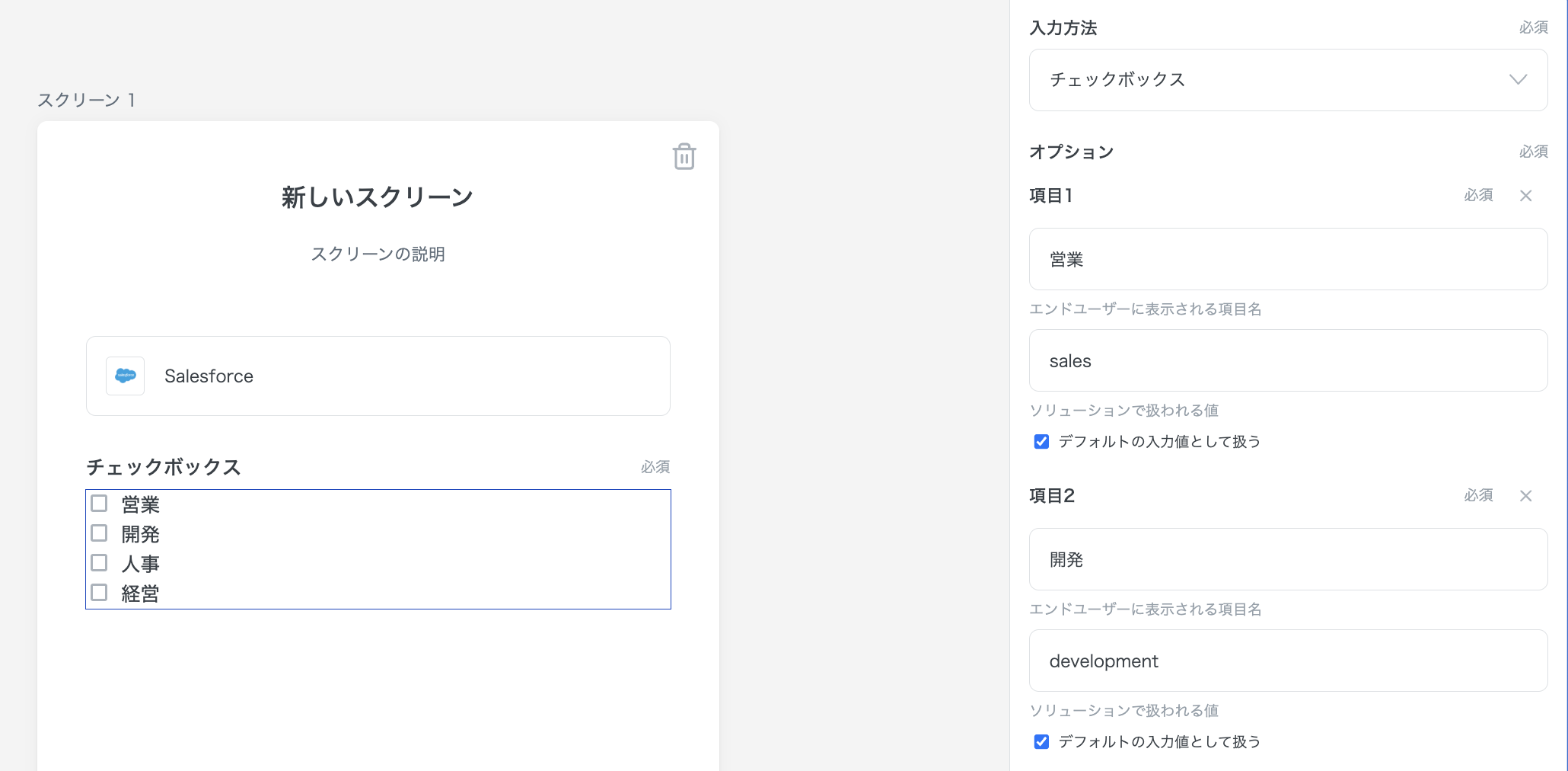 「デフォルトの入力値として扱う」にチェックを入れた項目がデフォルトで選択状態になります。(複数選択可)