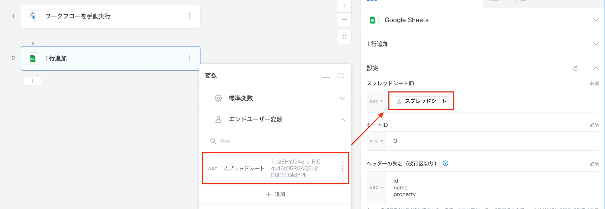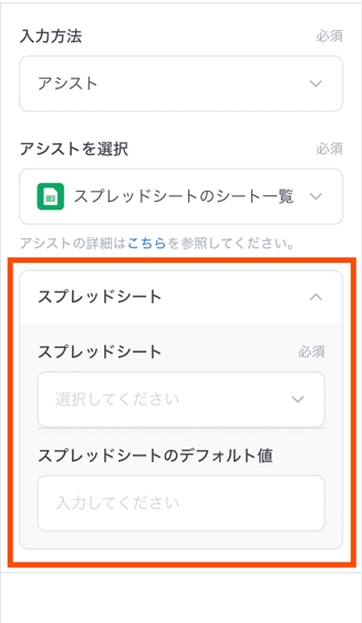 というエンドユーザー変数には、スプレッドシート一覧のアシストが設定されているため、スプレッドシートの情報がエンドユーザーから入力され、スプレッドシートのシートの一覧がアシストできるようになります。