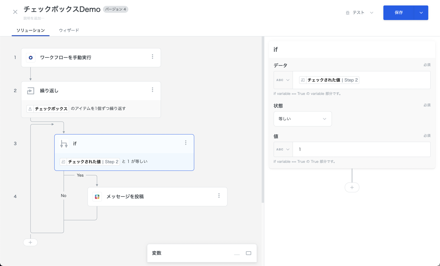 繰り返しアクションの中で if を用いて、1 と等しい場合に、Slackにメッセージを送信するようになっています。