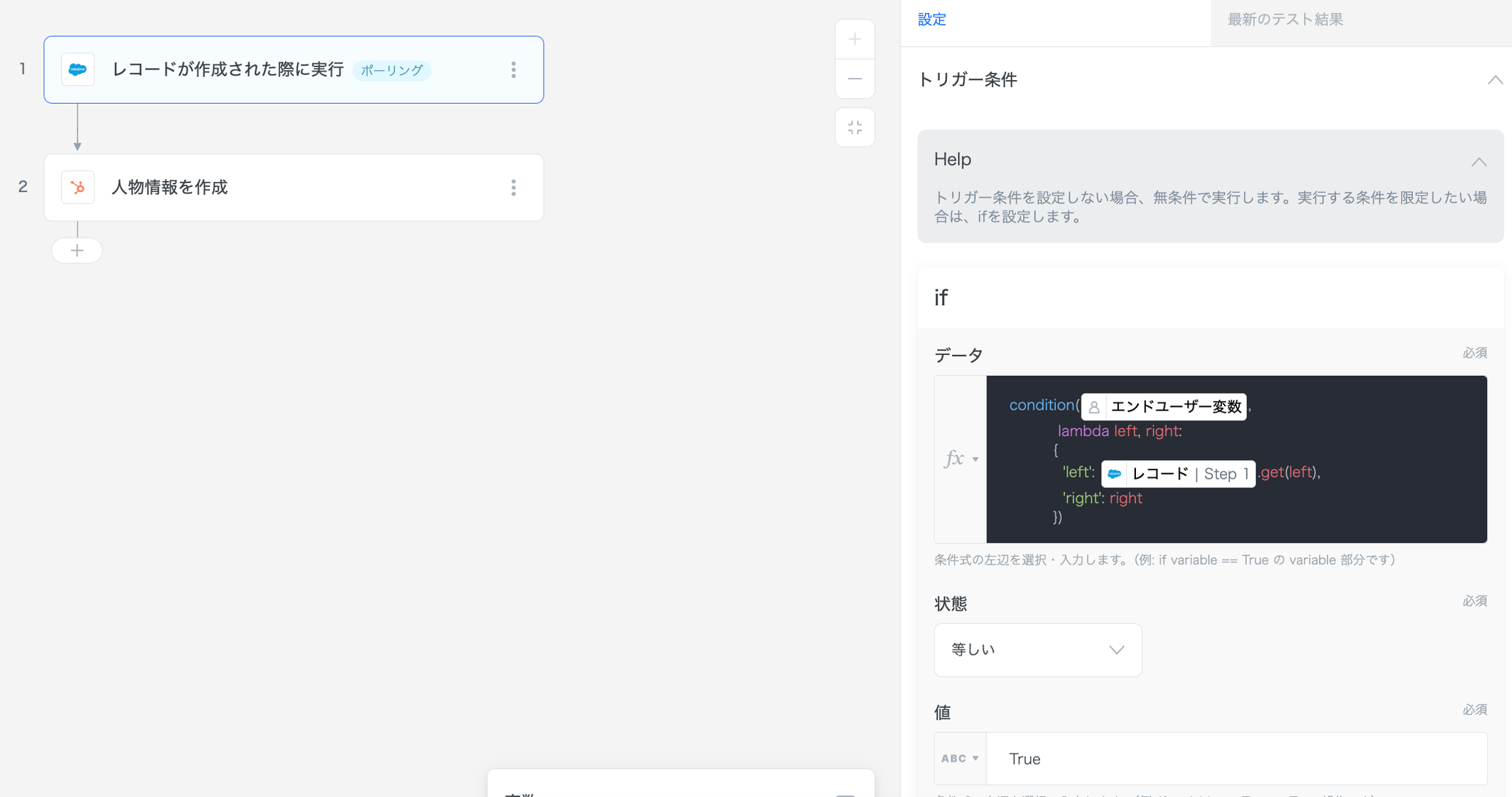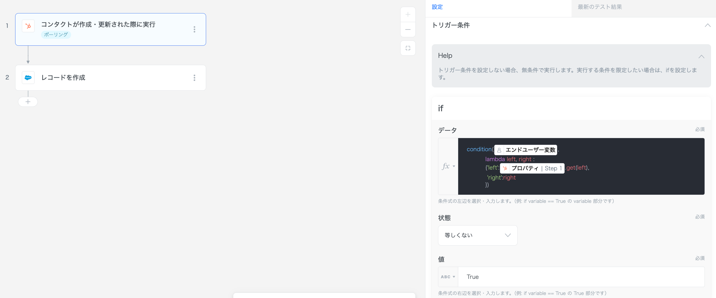 これにより、Salesforceのレコードが作成された際に、エンドユーザーが指定した条件が満たされた場合のみ、HubSpotにデータを連携することができます。
