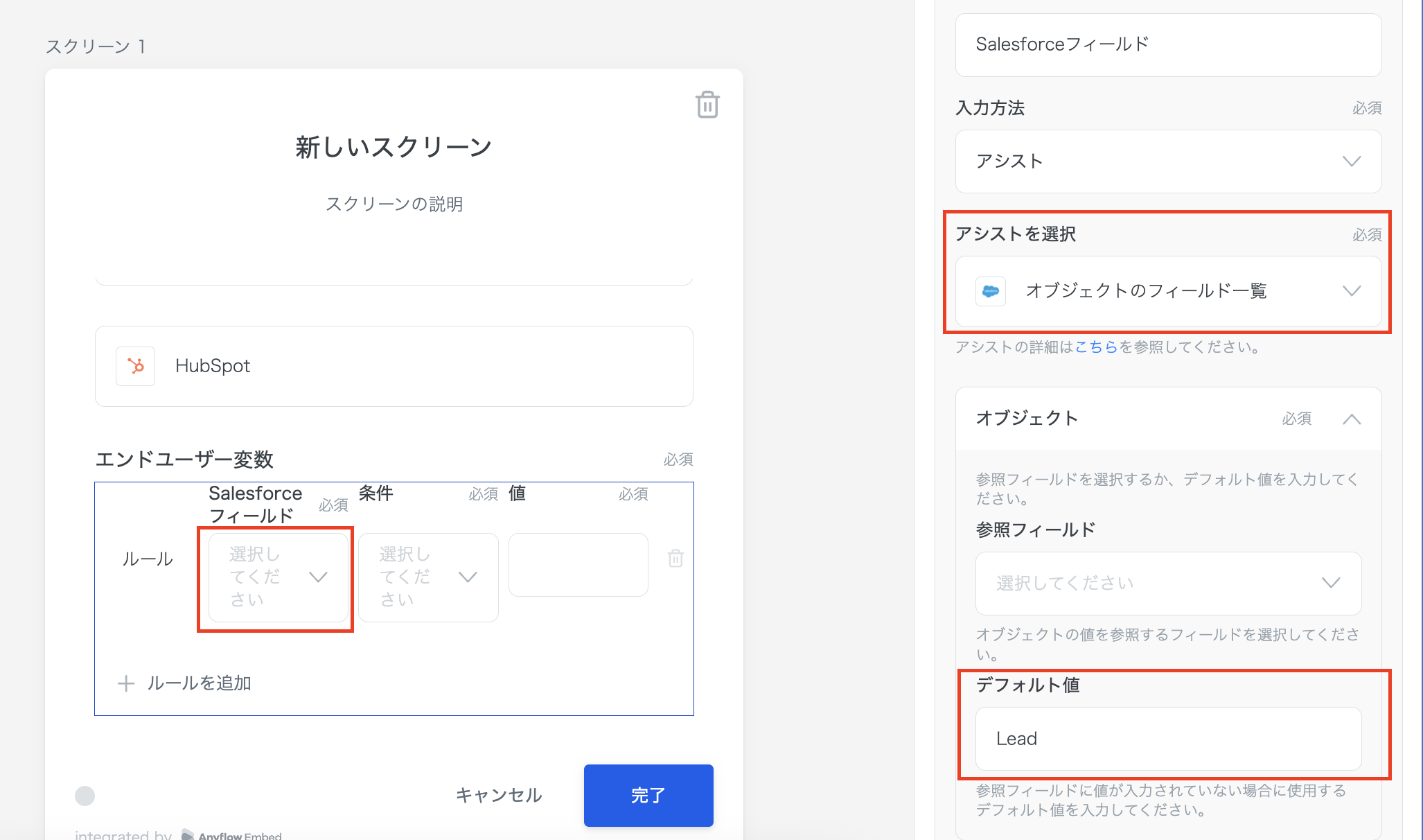 左辺はSalesforceの「オブジェクトのフィールド一覧」アシストとし、参照フィールドのデフォルト値は「Lead」にしておきます。