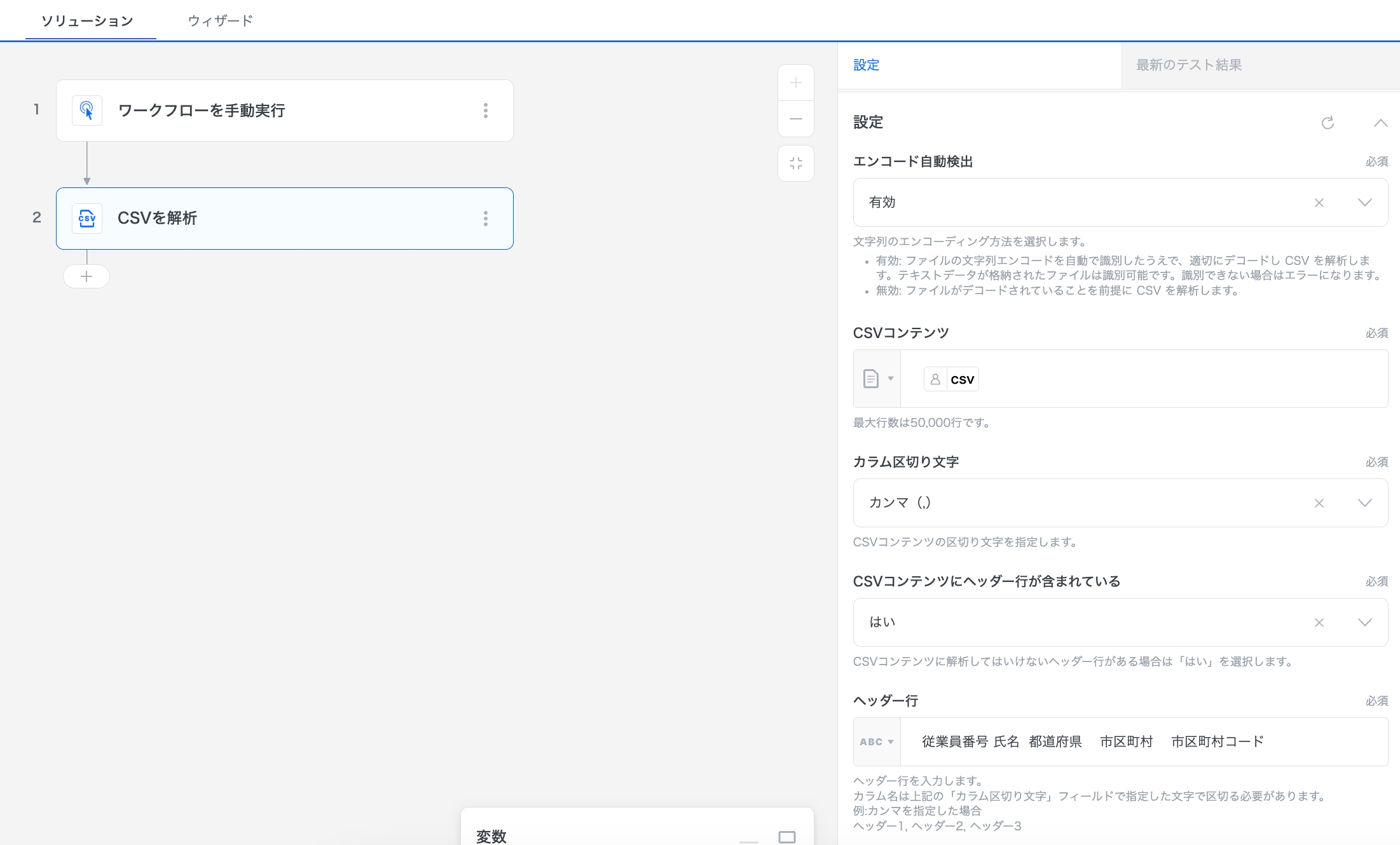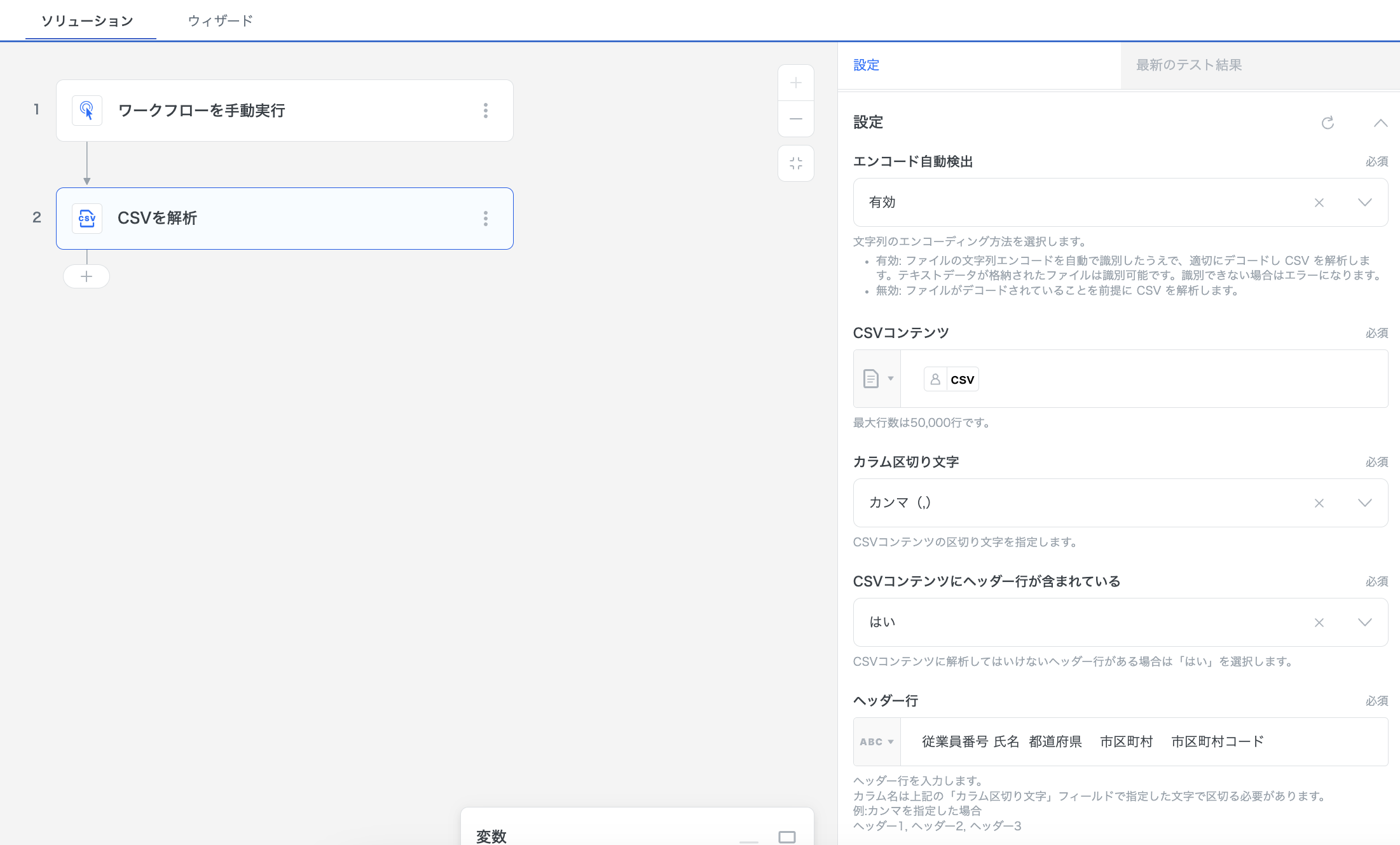 ソリューションの処理にCSVアクションを追加します。 CSVコンテンツにはエンドユーザー変数を設定し、区切り文字やヘッダーの内容を適切に入力します。
