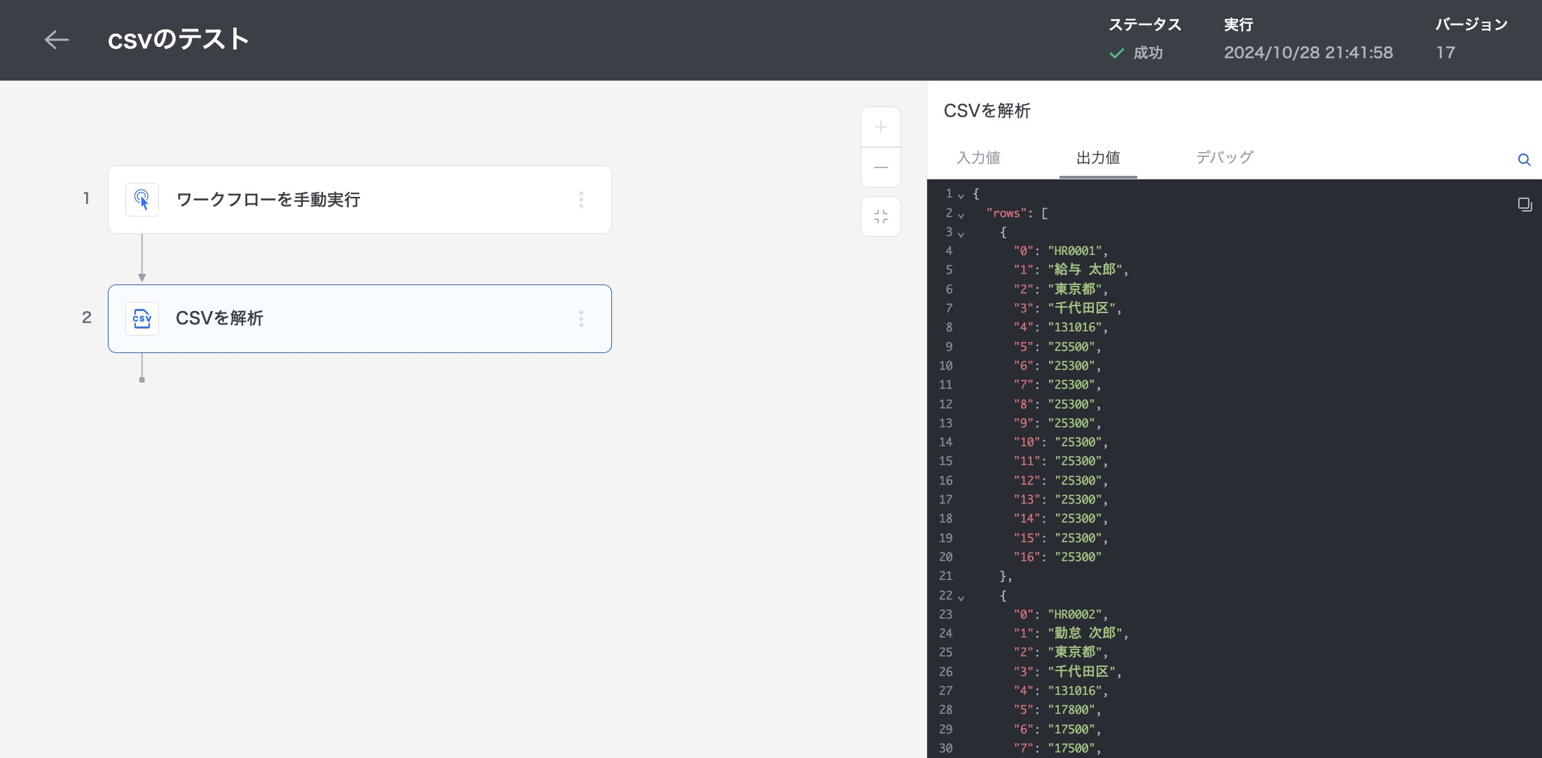 エンドユーザーがソリューションをインストールしソリューションが実行されると、CSVの各行が配列として処理されていることが分かります。