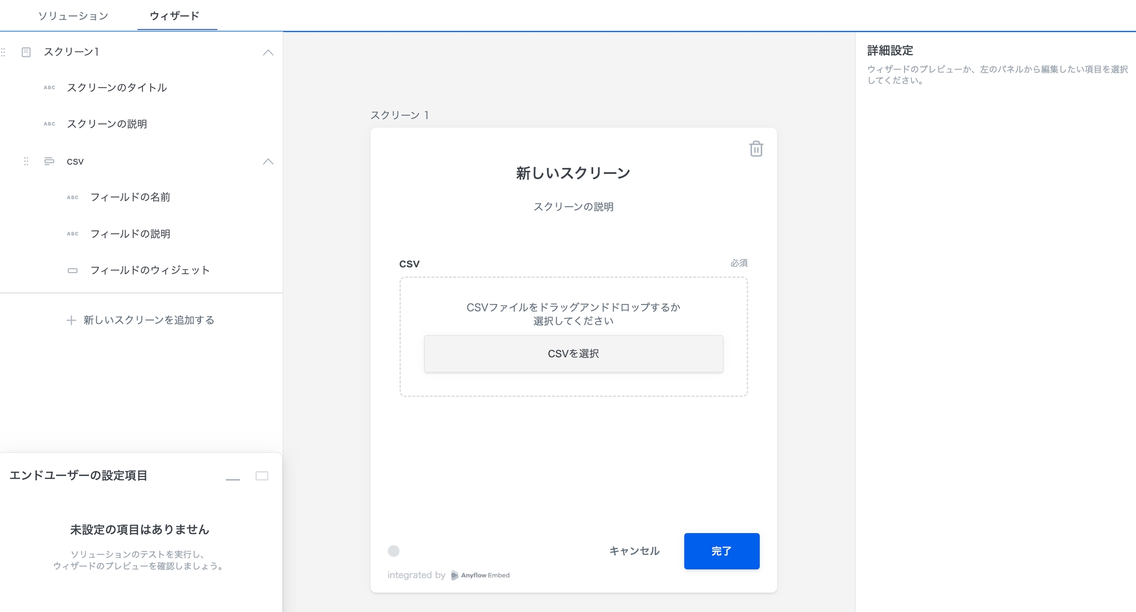 ウィザードでは、エンドユーザーにはCSVをアップロードするウィジェットが表示されます。