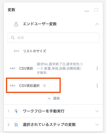 ソリューション内ではエンドユーザー変数にCSVのヘッダーがテキストで展開されます。