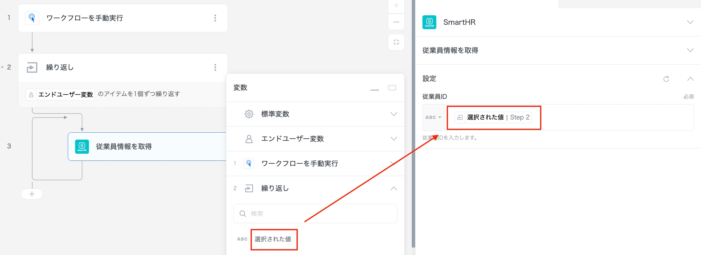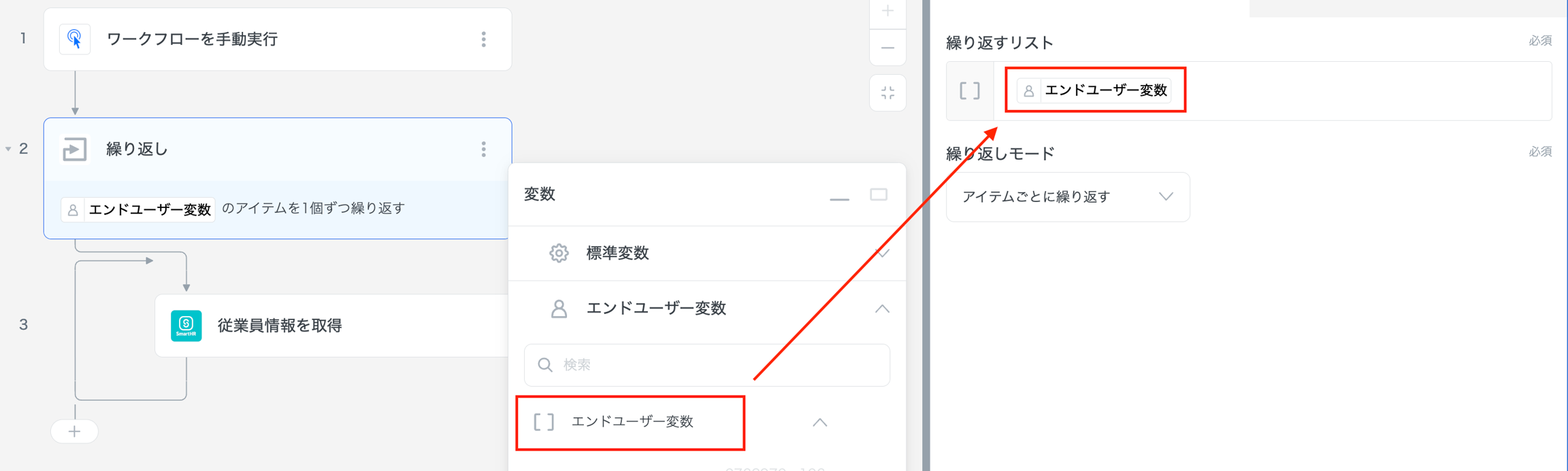「繰り返すリスト」にエンドユーザー変数(従業員IDの配列)を指定します。