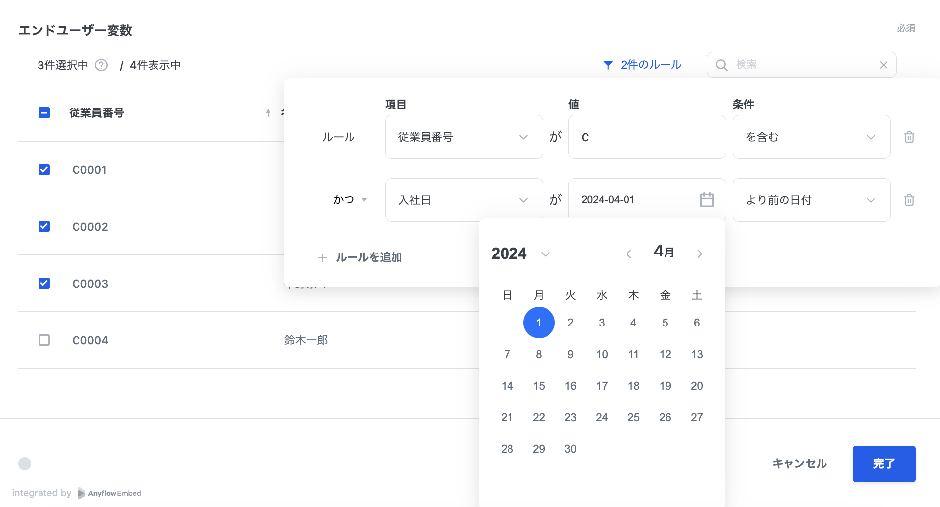「従業員ID」には繰り返しの「選択された値」を指定します。